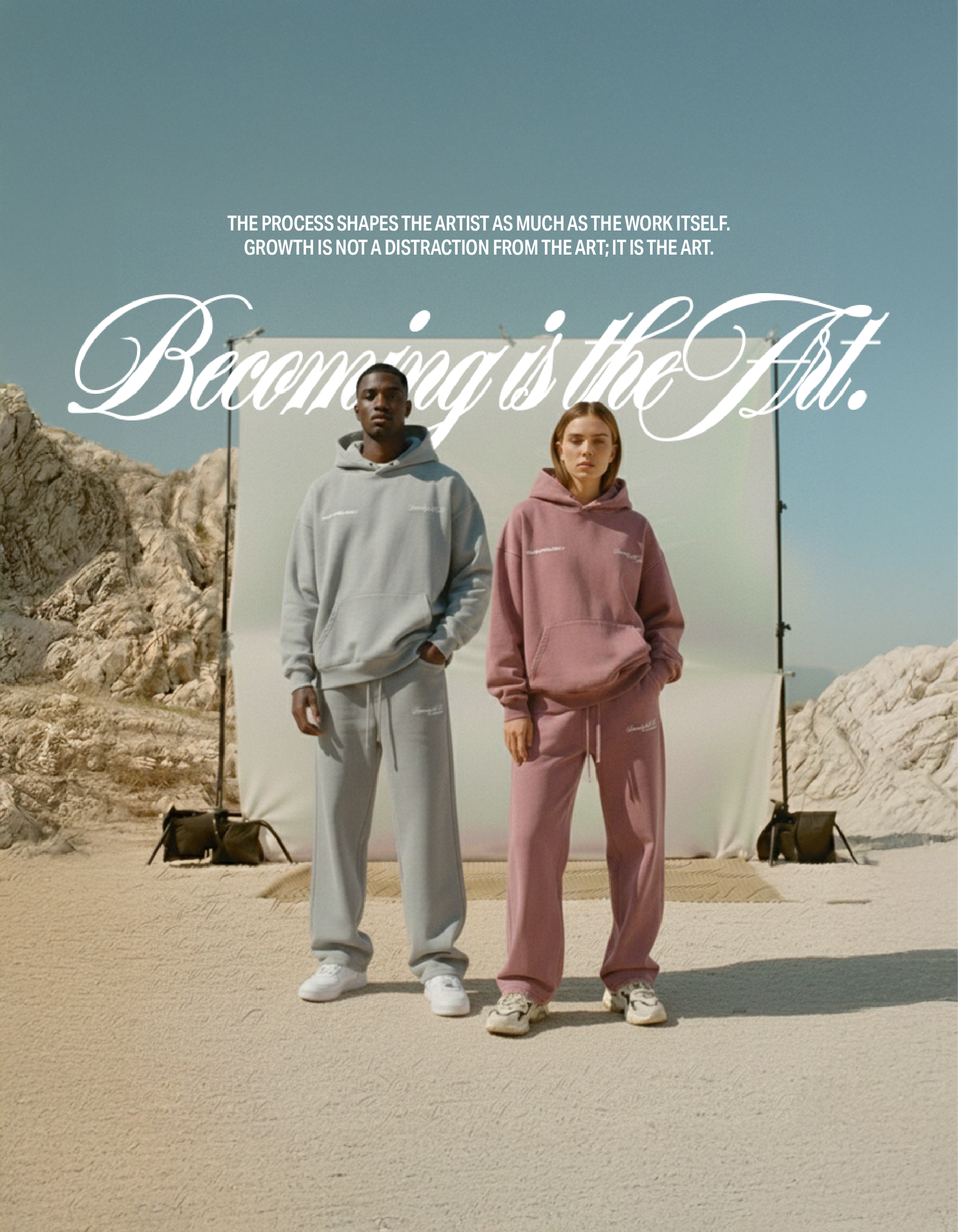 Esta colección lleva el nombre de la verdad que está en el corazón de SUR Project: el proceso moldea al creador tanto como la creación misma. “Becoming Is the Art” honra las pausas, los borradores y los nuevos comienzos — esos pasos silenciosos donde ocurre el crecimiento.